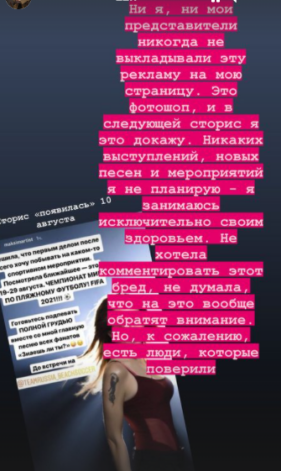 Исполнительница поспешила расставить все точки над i. "Никаких выступлений, новых песен и мероприятий не планирую. Я занимаюсь исключительно здоровьем. Не хотела комментировать этот бред, не думала, что на это вообще обратят внимание, но, к сожалению, есть люди, которые поверили", - заверила звезда. Как заявила певица, кто-то просто подделал так, что это сообщение якобы появилось на ее странице и распространил фото в Сети.