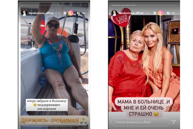 Дана поделилась с подписчиками печальной новостью Instagram. Телеведущая пока не уточняет, в каком сейчас состоянии мама, но она очень волнуется за нее. Блондинка опубликовала совместные фотографии с Екатериной Ивановной и оставила к ним подпись: "Извините, что пропала так надолго. Мама болеет Covid-19. В свете последних событий я очень переживаю. Держись, любимая. Сейчас мама в больнице, и мне, и ей очень страшно".
