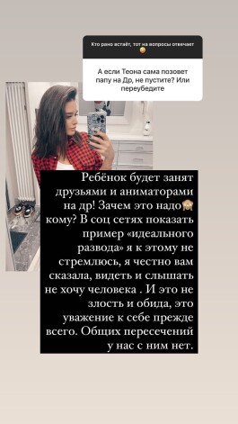 Например, как бывшие супруги собираются заниматься воспитанием дочери. «На день рождения Теоны будете приглашать отца?» — спросили ее подписчики. «Нет, я отмечу отдельно. Потом, если захочет, пусть справляют еще. Мы не общаемся с папой Теоны, и нет никакого желания общаться в будущем», — неожиданно призналась ведущая «Дома-2».
