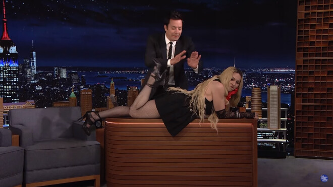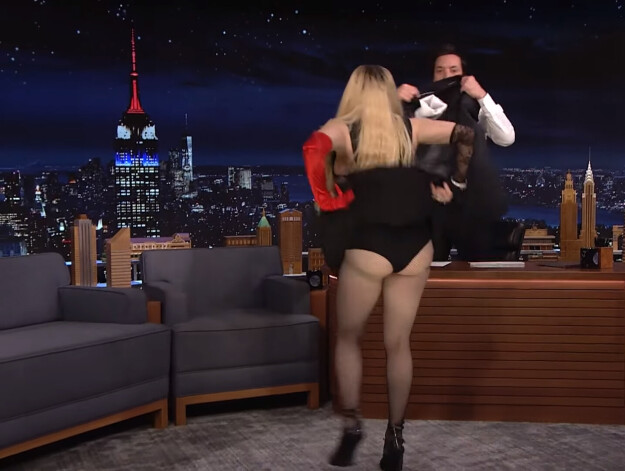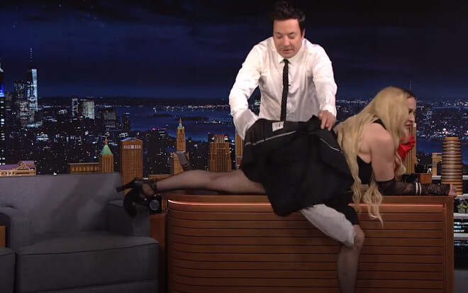С этими словами Мадонна взгромоздилась на стол ведущего и растянулась на нем. Лежа на животе, певица болтала в воздухе ногами в сетчатых колготках. "Нет! Мадонна! Прекрати! Я не знаю, что мне делать. Прекрати это сейчас же", - завопил телеведущий. Смущенный Джимми Фэллон стянул с себя пиджак и попытался прикрыть филейные части звезды. Не помогло. В ответ певица соскользнула со стола, повернулась спиной к зрителям, задрала юбку и продемонстрировала на камеру черные трусы. А потом уселась обратно на диван, весьма довольная собой.