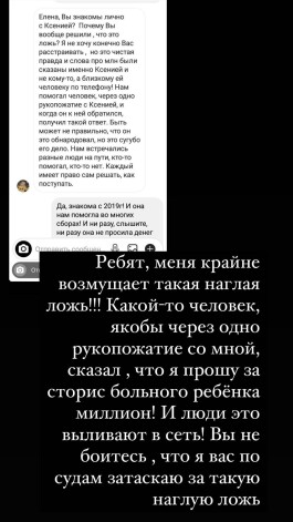 На защиту Бородиной встала куратор благотворительного фонда «Вера в детство» Евгения Югрина, которая опровергла негативные слухи в отношении Ксении. «На счету Ксении десятки спасенных жизней! Никогда, слышите, никогда Ксюша не просила денег за размещение поста! Я, Евгения Югрина, лично общаюсь с ней и заявляю: это все чудовищная ложь и клевета! Большего бреда, который выдумали эти люди, мы в жизни своей не видели! Ксюша сначала сама всегда вкладывается в сбор средств, а уже потом дает возможность и своей прекрасной аудитории принять участие в добрых делах! А сколько Ксения помогает, не афишируя, никто из вас и не догадывается!» — поделилась волонтер.