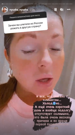Также певица отметила, что не прочь путешествий во время беременности, ведь она не привыкла сидеть на одном месте, даже находясь в ожидании малыша. Вторая беременность Нюши тоже протекает хорошо, и исполнительница, по ее словам, пока не знает, что такое послеродовая депрессия. «У меня не возникало такого. Как будет в этот раз — не знаю», — отметила певица.