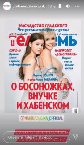 Недавно Марина Зудина с красавицей дочкой приняли участие в профессиональной съемке для еженедельного журнала «Антенна-Телесемь». Знаменитая мама была была одета в боди телесного цвета и расстегнутое серебряное платье. Мария была также запечатлена в серебряном наряде с открытыми плечами, пишет wmj.ru.