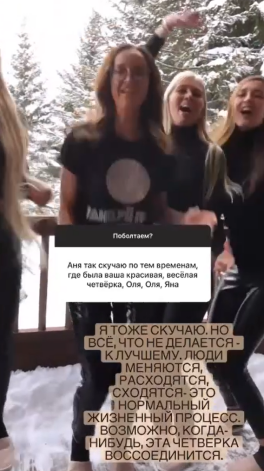 Пока неизвестно, что послужило причиной ссоры между подругами. но Анна призналась — эта передышка ей была необходима. «Я тоже скучаю, но все, что ни делается, все к лучшему. Люди меняются, расходятся, сходятся. Это нормальный жизненный процесс. Возможно, когда-нибудь эта четверка воссоединится», — поделилась 33-летняя Анна Бузова в личном блоге, опубликовав веселое архивное видео с участием сестры, Оли Десятовской и Яны.