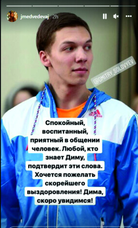 В социальных сетях Соловьева поддержала Евгения Медведева. По словам фигуристки, Дмитрий является по-настоящему добрым человеком, не способным на жестокость. «Спокойный, воспитанный, приятный в общении человек. Любой, кто знает Диму, подтвердит эти слова. Хочется пожелать скорейшего выздоровления. Дима, скоро увидимся», — рассказала Медеведева.