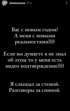 Также Омаров отметил, что у него есть все доказательства неверности экс-избранницы. «Вас с Новым годом, а меня — с новой реальностью! — отметил бизнесмен. — Если вы думаете, что я не знал об этом, то у меня есть видеоподтверждение. Я слышал за стеной разговоры за спиной».