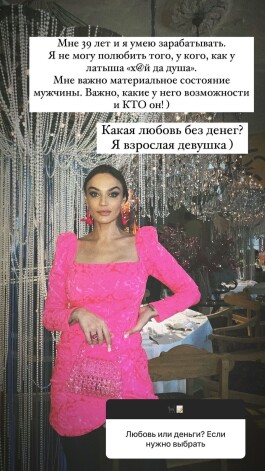 У Водонаевой спросили, что она выберет - любовь или деньги? На что Алена ответила довольно резко: "Мне 39 лет и я умею зарабатывать. Я не могу полюбить того, у кого, как у латыша "*** да душа". Мне важно материальное состояние мужчины. Важно, какие у него возможности и кто он. Какая любовь без денег?".