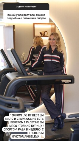 Поклонники, в частности, спросили ее про параметры, питание и возраст. «Рост 168, вес - 53 килограмма. Ем мало и стараюсь не есть вечером. 15 лет не ем мясо, кроме курицы. Спортом занимаюсь с тренером три-четыре раза в неделю», — поделилась Яна Рудковская.