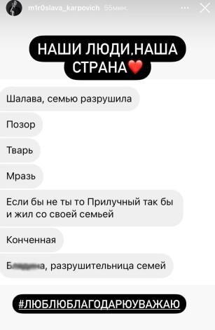Пикантной деталью стало то, что связь актеров якобы началась еще до развода Павла с Агатой Муцениеце, с которой он прожил восемь лет и завел двоих детей. Казалось бы, спустя время все эмоции поклонников должны были утихнуть, однако, как сообщила сегодня сама Мирослава, ее до сих пор продолжают считать разлучницей и буквально растаптывать ее достоинство на просторах Сети. «Шалава, семью разрушила! Позор. Тварь. Мразь. Если бы не ты, то Прилучный так и жил бы со своей семьей. Конченная. Б*****а (падшая женщина – прим.ред.), разрушительница семей», – написала Карпович одна из возмущенных подписчиц.