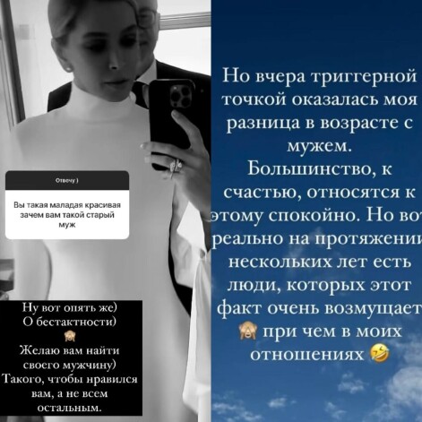 «Вы такая молодая, красивая, зачем вам такой старый муж?» — спросил анонимный пользователь. Своего «старого» мужа Вера в обиду не дает и отвечает хейтерам вежливо, но жестко. «Ну вот опять же о бестактности. Желаю вам найти своего мужчину. Такого, чтобы нравился вам, а не всем остальным», — написала Брежнева.