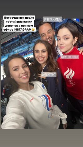 На трибунах можно было увидеть Евгению Медведеву, которая в Пекине комментирует фигурное катание вместе с Алексеем Ягудиным, а также Алину Загитову. Также Загитова опубликовала снимок с Медведевой, рассказав, что планирует комментировать выступления вместе с соперницей и другими спортсменами. «Встречаемся после третьей разминки девочек в прямом эфире», — объяснила счастливая фигуристка.