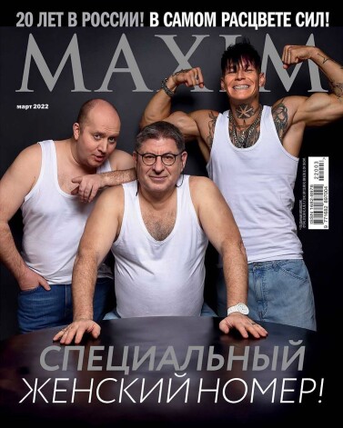 В Сети обсуждают обложку мартовского номера журнала Maxim. Ее героями стали актер Сергей Бурунов, психолог Михаил Лабковский и рэпер Niletto: на обложке они позируют в джинсах и белых майках.