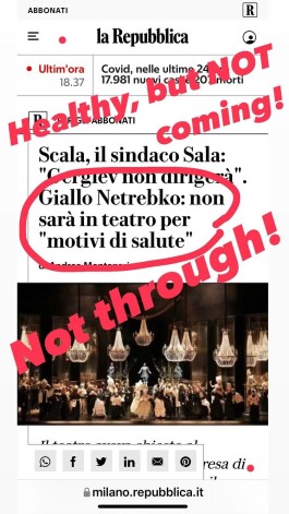 Анна Нетребко сразу решила прокомментировать публикации итальянских журналистов. Она обвинила представителей прессы во лжи. В числе прочего артистка заявила, что не собирается платить La Scala. «Я здорова, но не приеду. Неправда!» — резко сообщила Нетребко в разделе Stories на своей странице в Instagram. Кстати, ходят слухи, что певица лишилась работы и в Метрополитен-опере.