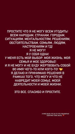 Однако еще неделю назад блогер написала публикацию с призывом к миру: "Вы знаете, как я далека от политики и что всегда избегаю политических тем, потому что не сильна в тонкостях, и считаю, что мои соцсети должны нести мир, а не разделять людей по точкам зрения, лояльности к власти или оппозиции, или по любым другим признакам. Я хотела и впредь буду хотеть выкладывать развлекательный контент, который всех объединяет, и оставаться пацифистом. И именно потому, что я пацифист сегодня я хотела бы высказаться.
