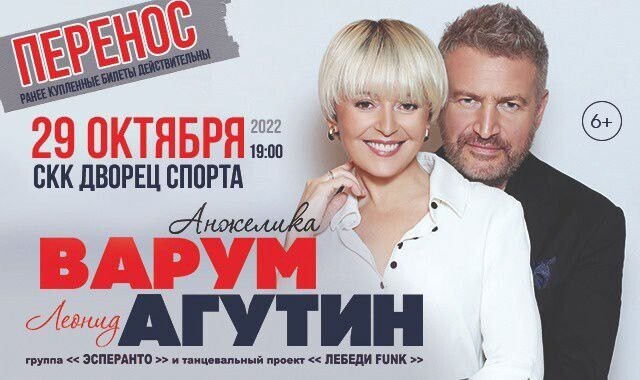 «От организаторов концерта: «По многочисленным просьбам жителей Самарской области концерт Леонида Агутина и Анжелики Варум переносится на 29 октября 2022 года. Все ранее купленные билеты действительны!» — рассказал Агутин.