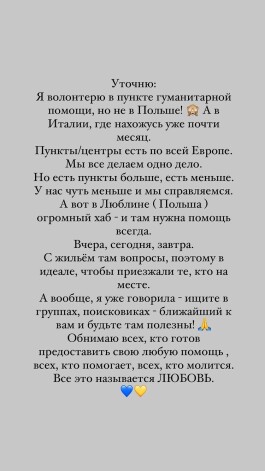 На днях Вера Брежнева опубликовала информацию о том, что трудится в волонтерском центре для помощи беженцам, а также попросила поклонников присоединиться к работе организации в Люблине. Из этого фанаты сделали вывод, что артистка находится в Польше. Как оказалось, певица действительно уехала из России, но в качестве направления выбрала другую европейскую страну. «Я волонтерю в пункте гуманитарной помощи, но не в Польше, а в Италии, где нахожусь почти месяц. Пункты есть по всей Европе. Мы делаем одно дело. Просто есть пункты побольше и поменьше. У нас поменьше, и мы справляемся, а в Люблине огромный хаб. Там помощь нужна всегда. Вчера, сегодня, завтра. С жильем там проблемы, поэтому лучше, чтобы приезжали те, кто уже на месте. Обнимаю всех, кто помогает, кто готов предоставить любую помощь. Это и есть любовь», — поделилась артистка.