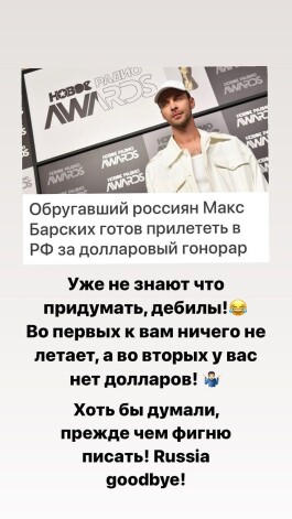 Как известно, Макс Барских отказался от концертов РФ и не вернет деньги за отмененные концерты. Но на российских инфоресурсах продолжают появляться сообщения о том, что Барских якобы «не отказался от всех выступлений и готов петь для олигархов в РФ». Представители артиста и он сам уже прокомментировали все фейковые новости. «Уже не знают, что придумать, дебилы! Во-первых, к вам ничего не летает, а во-вторых, у вас нет долларов! Хоть бы думали, прежде чем фигню писать! Russia goodbye!», — отметил артист в Instagram Stories.