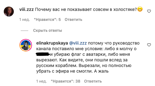 "Руководство канала поставило мне условие: либо я молчу о войне и убираю флаг с аватарки, либо меня вырезают. Как видите, они пошли вслед за русским кораблем. Вырезали, но полностью убрать с эфира не смогли. А жаль", – написала Крупская.