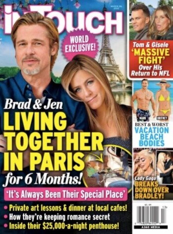 "Во-первых, заголовок таблоида на обложке: "Брэд и Джен живут вместе в Париже 6 месяцев!" было откровенной ложью. Энистон и Питт, конечно, не живут вместе в Париже уже несколько месяцев, потому что ни один из них не был в Париже так долго. Мы знаем это, потому что Энистон провела большую часть февраля на Гавайях, снимая тот самый проект, который привел ее во Францию. А поскольку Энистон находится во Франции по работе, мы уверены, что она не планирует задерживаться в течение нескольких месяцев после съемок. Энистон — известная домоседка, поэтому она, скорее всего, вернется в свой калифорнийски дом как можно скорее", – отмечает издание.