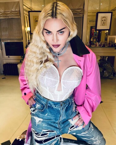 На кадрах Мадонна позирует в откровенном белом корсетном боди с глубоким вырезом и рваных синих джинсах. Образ дополняет ярко-розовый жакет Burberry с контрастным черным воротником и эффектной вышивкой на спине, пишет "Фокус".