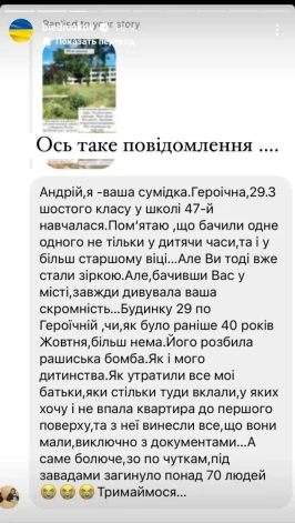 Досталось и дому, в котором он вырос, пишет УНИАН. "А за школой дом, где я вырос. Там была наша квартира. Почему "была"? Все просто. Попадание. Сгорела многоэтажка. Нас "освободили" от квартиры", - поделился телеведущий.