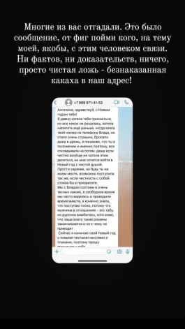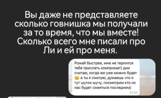 «… я понимаю, что ты в положении и именно поэтому все откладывала на потом, даже если честно вообще не хотела этим делиться. Но мне хочется войти в Новый год с чистой душой. Прости заранее, но будь ты на моем месте, возможно, поступила так же, если честность с собой стояла бы в приоритете. Мы с Владом состоим в очень тесных связях, в свободное время часто виделись и проводили время вместе…», — писала якобы любовница Влада.