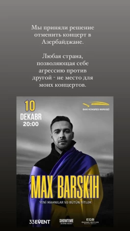 Украинский исполнитель Макс Барских отменил запланированный в Азербайджане концерт, который должен был состояться 10 декабря 2022 года. Причиной послужила агрессия ВС страны против Армении.