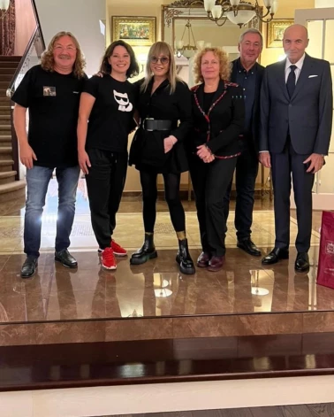 Друзья собрались, чтобы отметить выход цикла музыкальных пьес Николаева. Алла Пугачева в мини-платье с декольте и широким поясом зажгла в компании музыкантов. Она также надела легкие леггинсы и дополнила образ невысокими ботинками на массивный подошве.