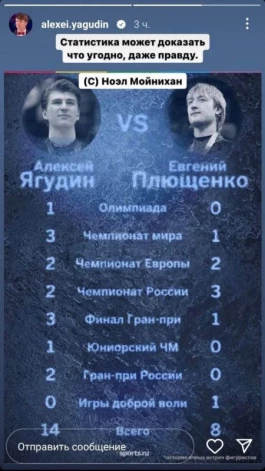 Сам Алексей Ягудин от комментариев в прессе пока отказывается. Вместо этого он опубликовал в своих соцсетях картинку с историей его личных встреч с Плющенко на турнирах (кто чаще занимал более высокое место). Счет оказался 14:8 в пользу Ягудина.