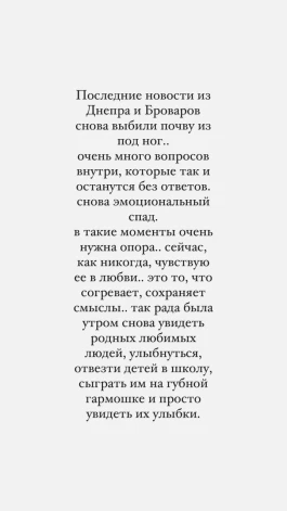 Ранее сегодня Брежнева рассказывала, что последние новости из Днепра и Броваров выбили у нее почву из-под ног. "В такие моменты очень нужна опора. Сейчас, как никогда, чувствую ее в любви. Это то, что согревает, сохраняет смысл", - поделилась Вера.