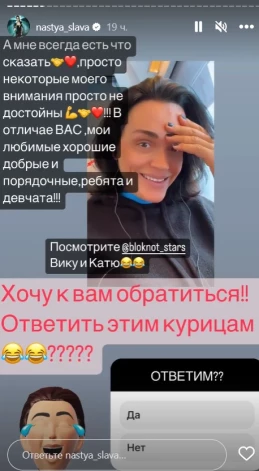 Подписчики певицы стали ей отправлять вырезки из передачи, и она не смогла проигнорировать происходящее. «По порядку! Да, я ненормальная и горжусь этим! Я все-таки звезда как никак, от скромности не умру. У меня сильный характер и сильное, по крайне мере, физическое здоровье. Я могу работать, пить и отдыхать очень много и очень долго. А мне всегда есть что сказать, просто некоторые моего внимания не достойны! В отличие от вас, мои любимые, хорошие, добрые и порядочные ребята и девчата», — обратилась Анастасия Сланевская (настоящее имя звезды).