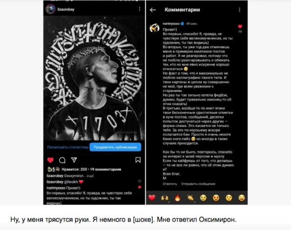 "Ну, я немного в а***. Мне ответил Оксимирон", — написала в своем Twitter пользователь LizaOrobey, ранее опубликовавшая в Instagram очередной рисунок рэпера (доступ к оригинальному твиту в настоящее время ограничен).