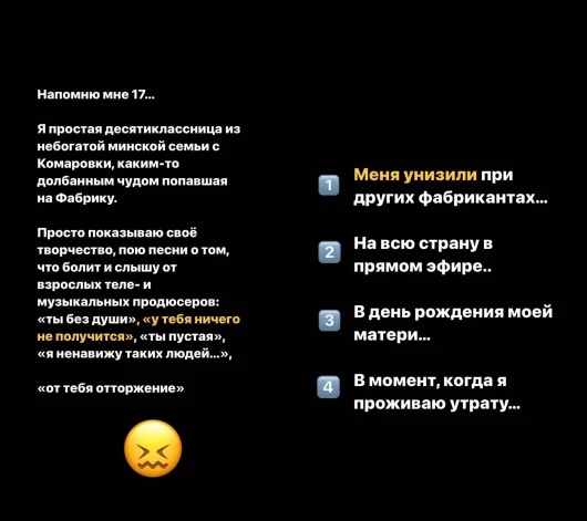 Рита отчаянно хотела покинуть шоу. «Меня унизили при других фабрикантах на всю страну в прямом эфире, в день рождения моей матери, в момент, когда я переживаю утрату. Несколько дней я рыдала в солярии, это было единственное место без камер. А потом написала песню о его смерти. И спела, захлебываясь от слез на сцене. Это была как раз моя «номинация на выбывание из проекта», — пишет она.