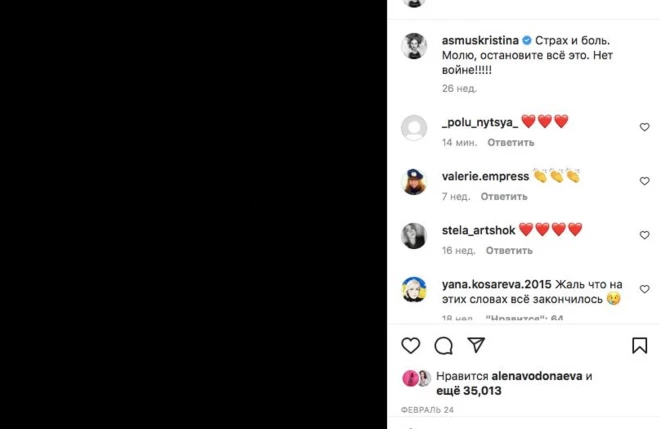 Чтобы избежать вероятного наказания и не лишить себя возможности зарабатывать, Асмус свой пост удалила. В суде адвокат артистки намекнул, что она поддерживает войну, поскольку он защищает свою клиентку, только убедившись в ее "патриотичной" позиции.