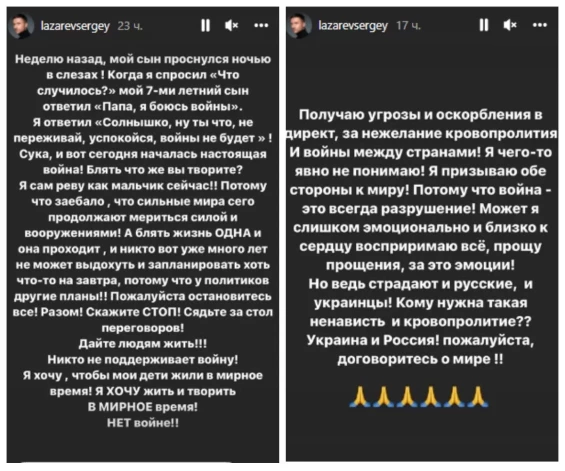 Сергей Лазарев в день полномасштабного вторжения, 24 февраля 2022-го, написал у себя в соцсетях эмоциональный пост с осуждением действий родной страны: "Сука, сегодня началась настоящая война! Бл*ть что же вы творите? Я сам реву как мальчик сейчас! Потому что за*бало, что сильные мира сего продолжают мериться силой и вооружениями".