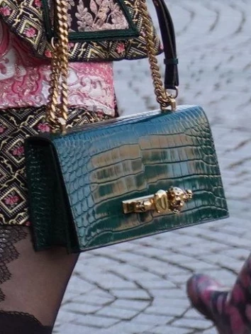 На ней был костюм Dolce & Gabbana стоимостью не менее 2500 евро, на ногах — сатиновые туфли стоимостью 1190 евро из коллекции Louis Vuitton этого года, а на плече — сумка Alexander McQueen цвета сапфира из 100% телячьей кожи. Такую сумку, украшенную позолоченными элементами и кристаллами Swarovski, можно приобрести за 2690 долларов на официальном сайте бренда.