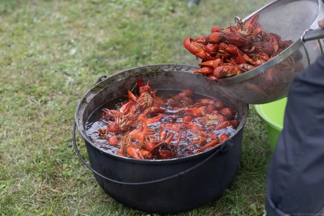 Конечно, в духе Круминьша своих гостей с пустыми животами не отпускать, поэтому собравшимся на стол подавали суп из баранины и обильный ассортимент холодных закусок, в том числе различные сыры, сало и варенья, а вечером все могли угоститься приготовленным там же жареным поросенком, ягненком и несколькими десятками килограммов только что сваренных раков.