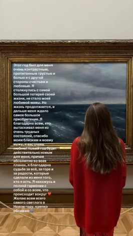 «Я благодарна всем, кто вытаскивал из очень трудных состояний, спасибо моим близким и моему мужу, я вас очень люблю. Новый год будет действительно новым для меня, причем абсолютно во всех смыслах, я благодарна судьбе за всё, за горе и за радости, которые сделали из меня того, кто я есть. Я нахожусь в полной гармонии с собой и со всем, что происходит вокруг», — резюмировала будущая мама.
