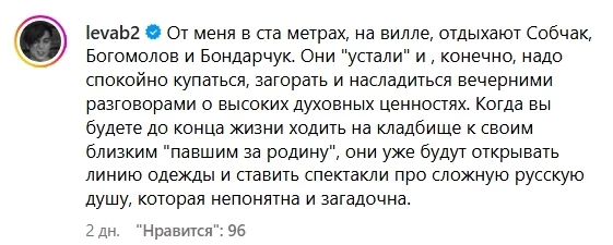 Особое возмущение у него вызвало поведение известных личностей и пропагандистов, которые продолжают беззаботно отдыхать. «От меня в ста метрах, на вилле, отдыхают Собчак, Богомолов и Бондарчук. Они "устали" и, конечно, надо спокойно купаться, загорать и насладиться вечерними разговорами о высоких духовных ценностях. Когда вы будете до конца жизни ходить на кладбище к своим близким, "павшим за родину", они уже будут открывать линию одежды и ставить спектакли про сложную русскую душу, которая непонятна и загадочна», — отметил Бортник.