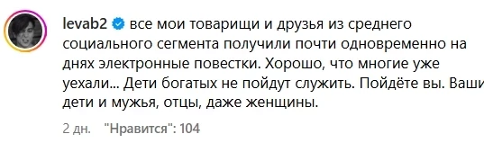 «Все мои товарищи и друзья из среднего класса получили электронные повестки. Хорошо, что многие уже уехали... Дети богатых не пойдут служить. Пойдете вы, ваши дети, мужья, отцы, даже женщины», — написал музыкант, обвинив власть в двойных стандартах.