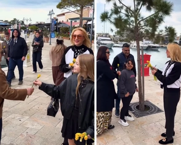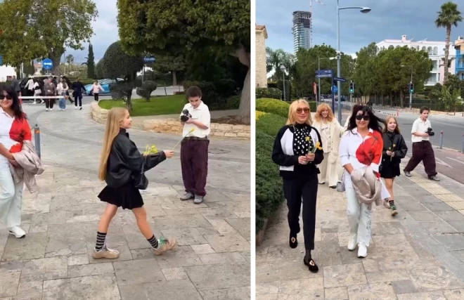 На этот раз празднование прошло в Лимассоле и выглядело максимально камерным — только близкие. При этом смысл традиции в кадре показан очень конкретно: семья не просто держит букеты, а дарит желтые цветы случайным прохожим во время прогулки.