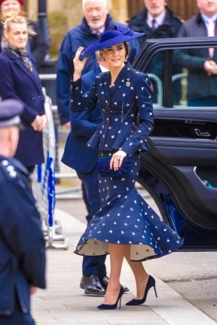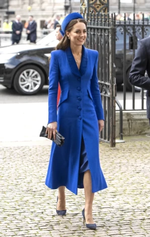 Весной 2022 года Кэтрин привлекла внимание ярко-синим пальто-платьем, созданным тем же модным домом Catherine Walker. Тогда, будучи герцогиней Кембриджской, она оставила волосы распущенными и дополнила образ шляпкой в стиле Жаклин Кеннеди.