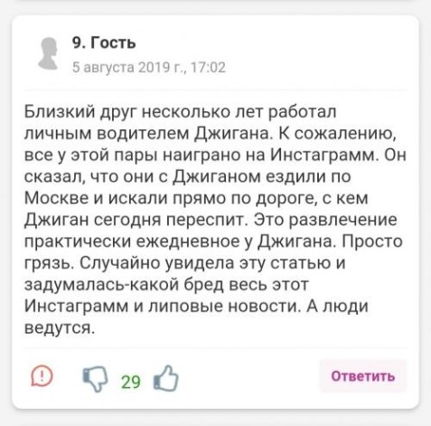 Однако такая идиллия для многих кажется наигранной. И не зря. Время от времени в Сети появляются слухи о том, что Джиган изменяет своей жене. В любовницы рэперу приписывали и модель Нину Липкину, и известную бодибилдера из Санкт-Петербурга, и простых девушек. Сейчас же данную информацию подтверждает личный водитель артиста. Он рассказал об изменах Джигана своему другу, который довел эти компрометирующие сведения до нас. Выяснилось, что статус девушек не интересует рэпера. Водитель в течение нескольких лет помогал ему искать спутниц на ночь даже просто на улицах столицы.