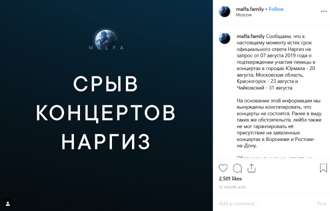 Продюсерский центр Максима Фадеева MALFA объяснил причину ухода Наргиз. Официальный комментарий размещен профиле лейбла в Instagram. Представители продюсерского центра заявили, что певица постоянно игнорировала их запросы и не подтверждала свое участие в запланированных гастролях. По этой причине MALFA принял решение расторгнуть контракт со знаменитостью.
