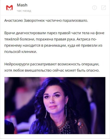 Сегодня медики сообщили, что Заворотнюк остается в реанимации. Анастасию частично парализовало на фоне онкологического заболевания. Врачи диагностировали парез правой части тела, поражена правая рука.
