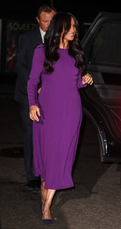 Для торжественного события герцогиня Сассекская выбрала фиолетовое платье миди с небольшим разрезом спереди. Это наряд от Babaton by Aritzia стоимостью 107 фунтов