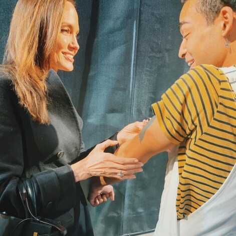 Это кадр опубликовал в соцсети молодой актер Алекс Томас Смит, задействованный в постановке спектакля «Дорогой Эван Хэнсен» в одном из театров лондонского Уэст Энда. Ему посчастливилось встретиться с Джоли, когда та пришла посмотреть шоу с его участием.