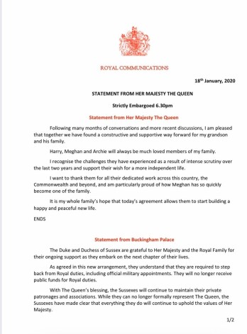 Как сказано в заявлении Букингемского дворца, Гарри и Меган понимают, что теперь им придется отказаться от исполнения королевских обязанностей, в том числе от официальных мероприятий, связанных с армией.