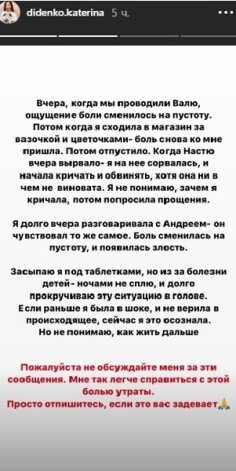 После похорон супруга блогер сообщила в Instagram-историях, что ее дети заболели: маленький сын захворал еще до злополучного дня рождения, а дочь Настя заразилась от него. Состояние девочки усугубило переживания Екатерины, и она не сдержала эмоций.